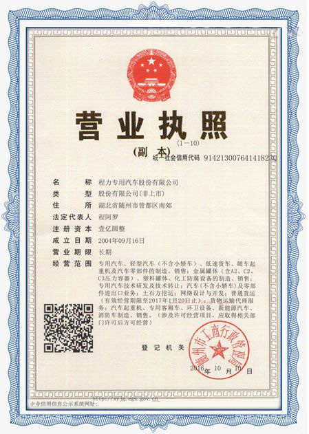 程力專用汽車股份有限公司各類專用汽車的專業(yè)廠家,大型專用汽車廠。國內(nèi)園林綠化、石油化工、市政環(huán)衛(wèi)、壓力容器專用汽車商。注冊“程力威”牌,產(chǎn)品代碼:“CLW”。東風、解放、福田、重汽、陜汽、北奔等公司的重要合作伙伴,主要從事各類專用汽車的業(yè)務,同時也銷售各大型廠家的整車及配件。公司擁有自行出口權,其主導品種有灑水車系列、吸污(吸糞)車系列、垃圾車系列、掃地車系列、油罐加(運)油車系列、高空作業(yè)車系列、清障車系列、隨車吊系列、自卸車系列、教練車系列、半掛車系列、化工車系列、消防車系列、廂式(冷藏車)系列、牽引車系列、粉粒物料車系列、攪拌車系列、壓力容器系列、專用車配件等十八大系列300多個品種車型。同時批發(fā)東風、解放、楚風各種二類底盤。
